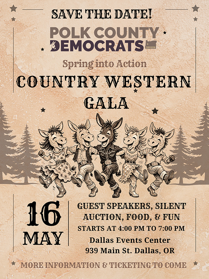 Mark your calendars! The Polk County Democrats will host their Spring into Action Country Western Gala on Saturday, May 16, from 4:00–7:00 PM at the Dallas Events Center (939 Main St., Dallas, Oregon). The evening will feature guest speakers, a silent auction, food, and plenty of fun, all in a lively country-western atmosphere. Additional details and ticket information will be announced soon.